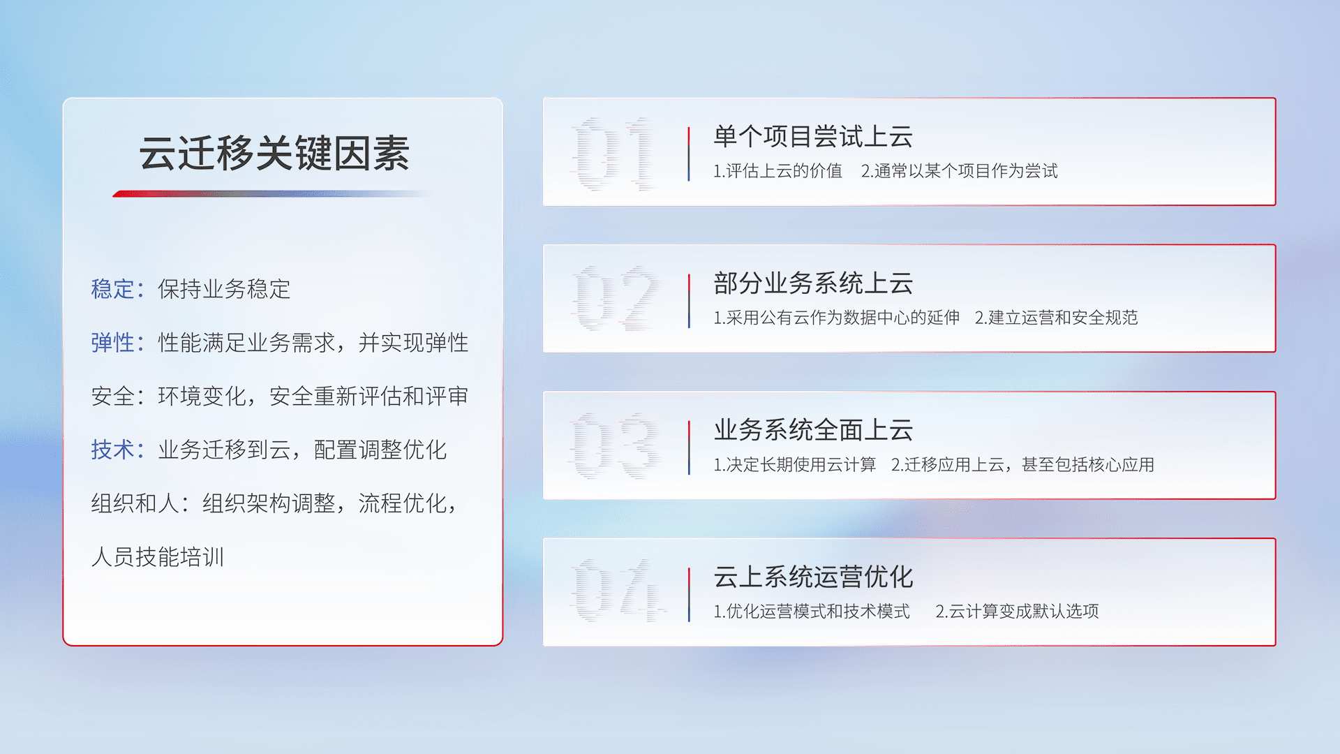 结合实际业务,,从规划设计、、云平台选型、、云原生改造、、、数据迁移、、、集成交付,,,,迁移全过程为客户识别最佳上云路径,,做好风险识别管理,,,设计网络架构、、身份权限、、、、安全审计合规、、、操作审计、、、、日志审计、、监控告警策略、、、、多站点容灾设计等,,对云上基础设施进行整体规划,,,提升IT治理水平,,以满足弹性、、、高可用、、高性能的需求。。
