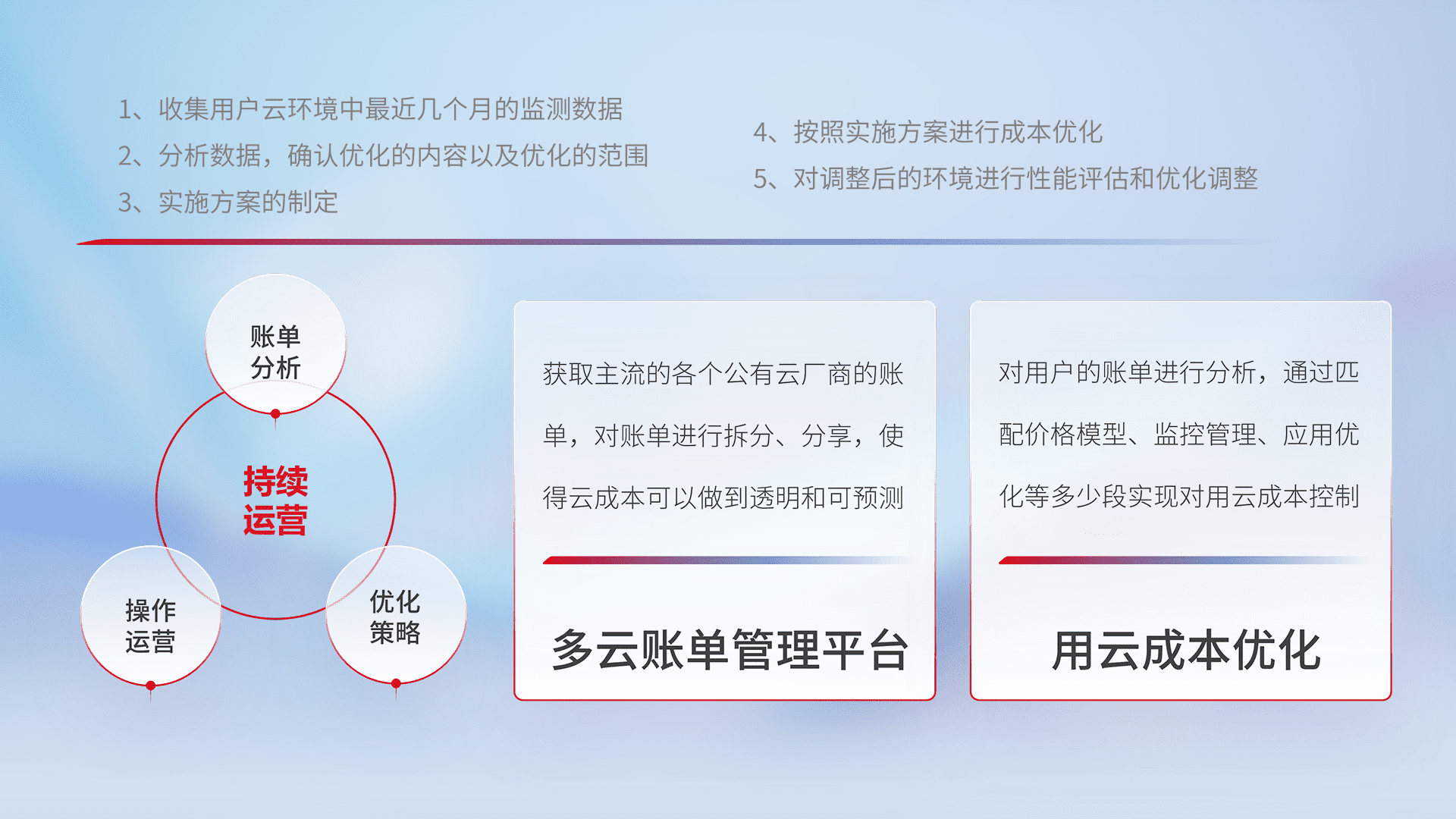 通过多云纳管,,,,以统一的资源数据模型把客户的云资源进行抽象和封装,,,,进而实现对多云资源的统一操作,,保障云资源管理的可靠性、、稳定性与可用性。。。量身定制化运维内容,,,配置、、、开发运维、、补丁管理、、、、备份、、、监控、、、、认证和访问管理、、审计和日常巡检等,,保障在用云过程中的可靠度,,,稳定度以及高可用率。。。。